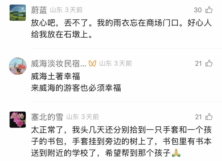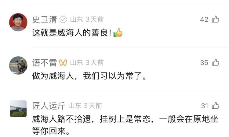 而面对网友的关注,不少威海人却十分淡然地表示:“这很常见,在威海,捡到东西挂在树上,回来找准没错。”