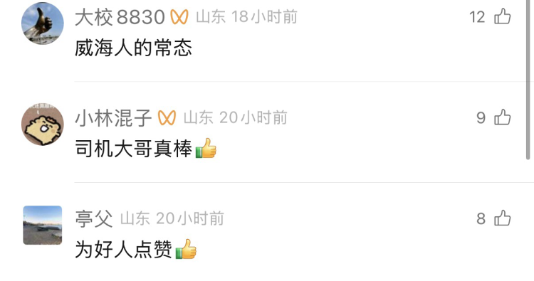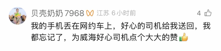 网友评论:“这就是威海人的常态啊!不图回报,拾金不昧,郭师傅用一件小事,让外国游客看到了中国的善意,也让威海的形象更动人❤️ 为平凡又伟大的出租车司机点赞!”